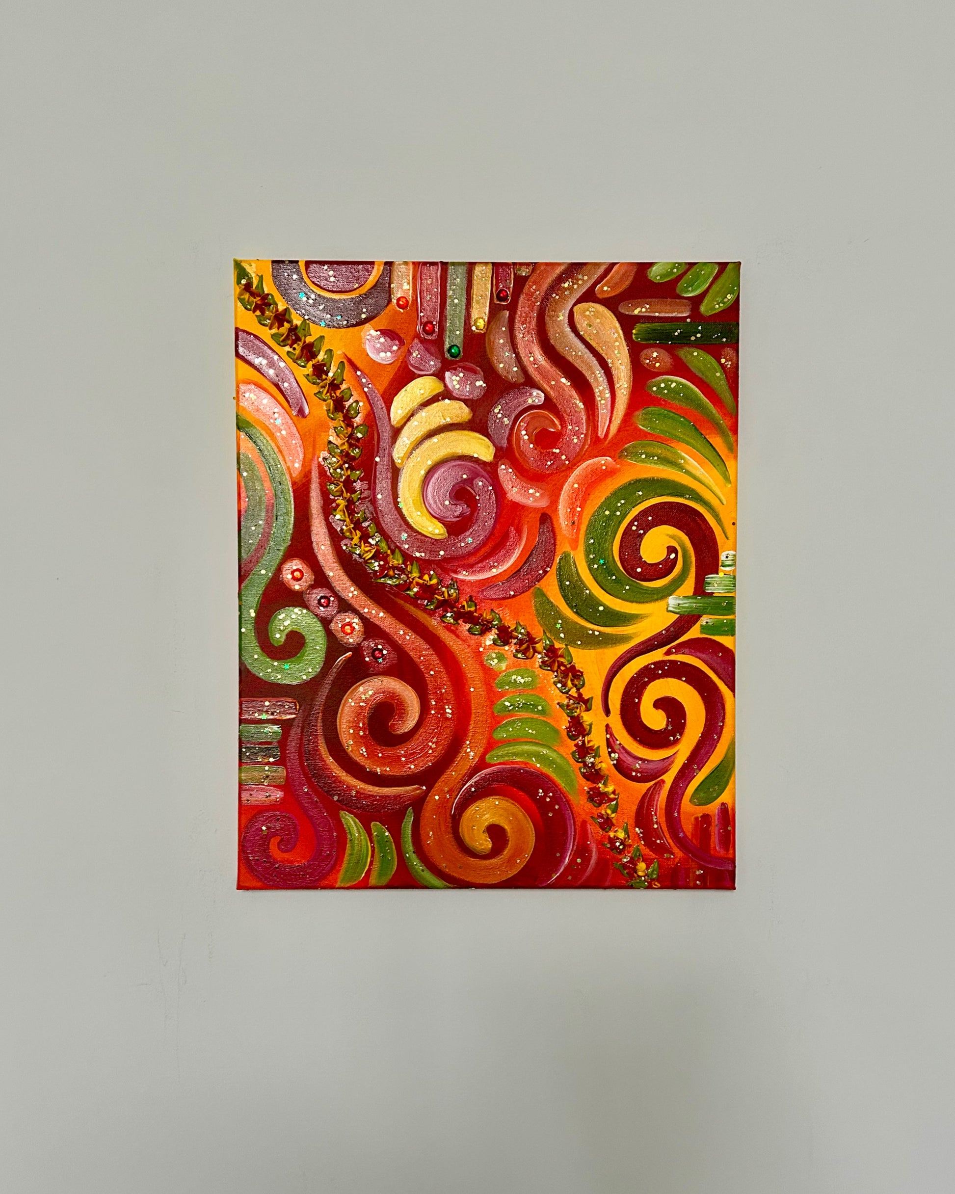 16” x 20” (inches) acrylic on canvas with modeling paste. Explores many tropical colors and includes details with glitter and modeling paste. Hand signed on the back.