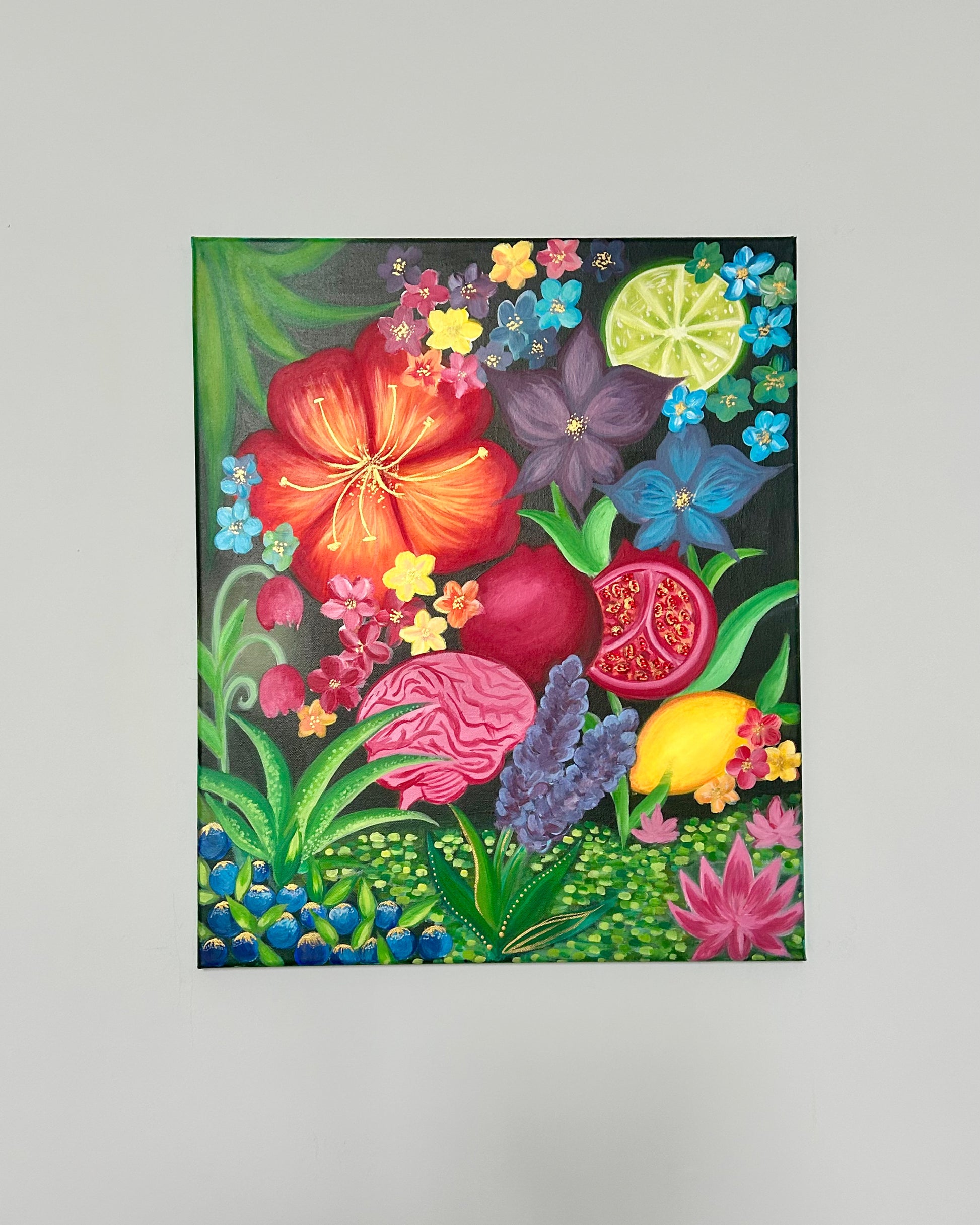 20” x 24” (inches) acrylic on canvas. Explores different fruits and flowers to create a tropical piece with a variety of colors! Hand signed in the back.