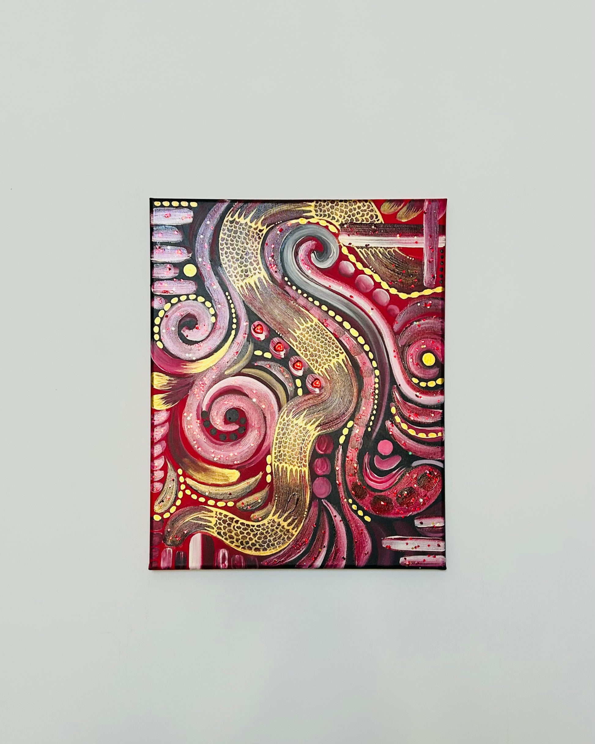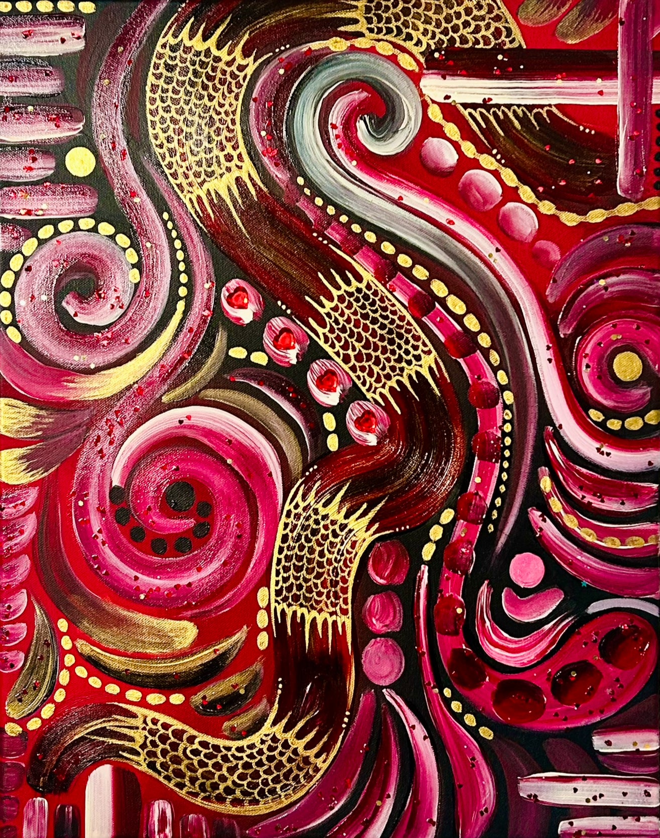 16” x 20” (inches) acrylic on canvas. Incorporates dark tones of red and black with red glitter and gold details to accentuate the piece. Hand signed on the back.