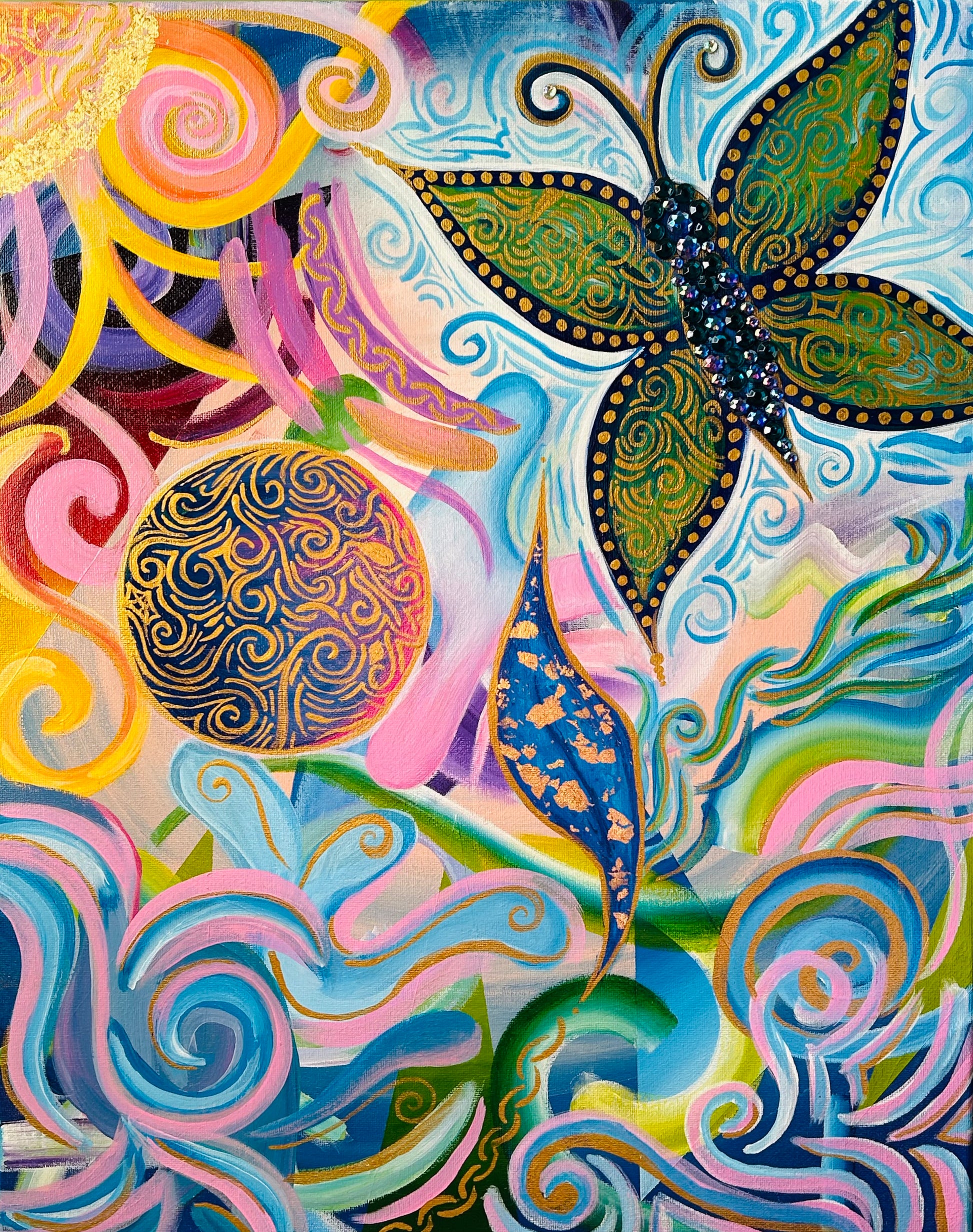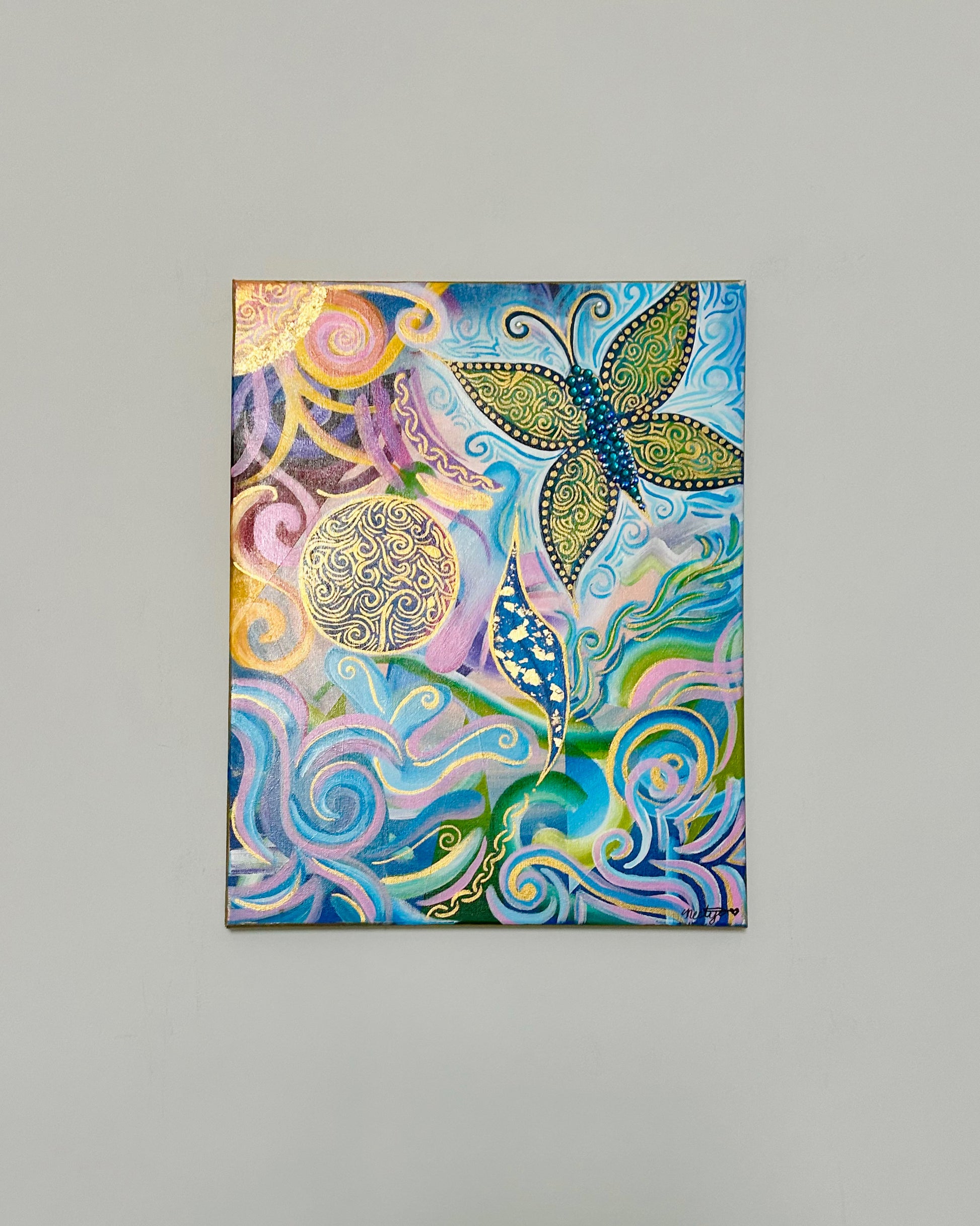 16” x 20” (inches) acrylic on canvas. Includes a variety of different colors to give off a chaotic dream-like vibe. Hand signed on the back.