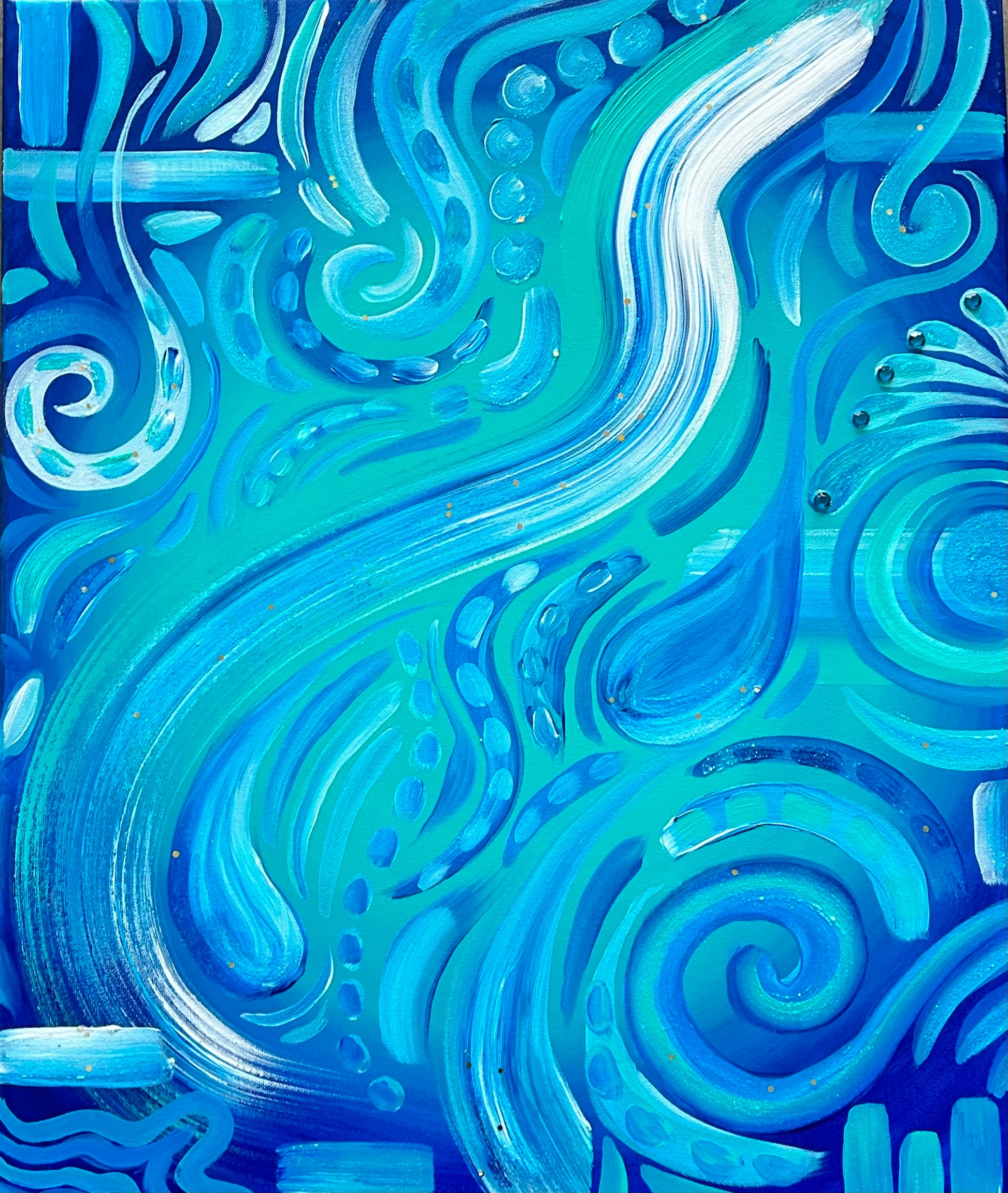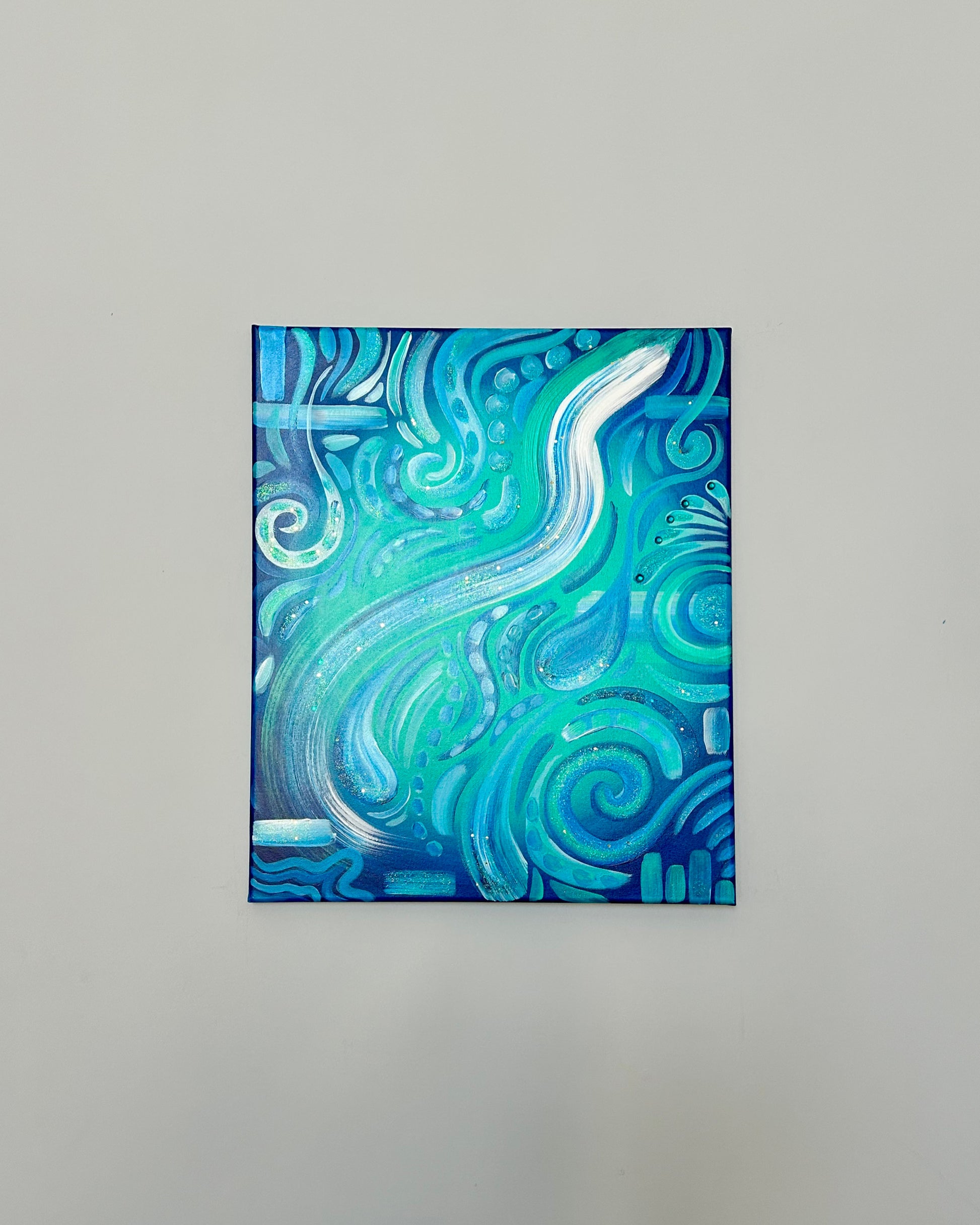 20” x 24” (inches) acrylic on canvas. Includes vibrant colors and details that look similar to toothpaste! Dark teal gems and glitter particles are also in this piece. Hand signed on the back.